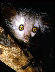 This family contains a single species, the highly distinctive aye-aye. These animals are around 400 mm long excluding the bushy tail, which more than doubles the body length. The fur is long, woolly, and dark brown in color. The combination of bushy tail and woolly fur gives the animal a sort of unkempt, shaggy appearance. Aye-ayes have large, naked, mobile ears, a muzzle that is shorter than that of most lemurs but longer than lorises, and large eyes with yellowish brown irises.